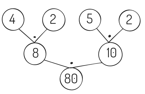 Obliczenia na drzewkach wykonuj od góry do dołu, w taki sposób, że operację matematyczną (w tym przypadku mnożenie) zapisaną pomiędzy kółeczkami wykonujesz na liczbach w tych kółkach, a wynik piszesz w kółeczku pod spodem. Liczba w kółeczku na samym dole to wynik działania.