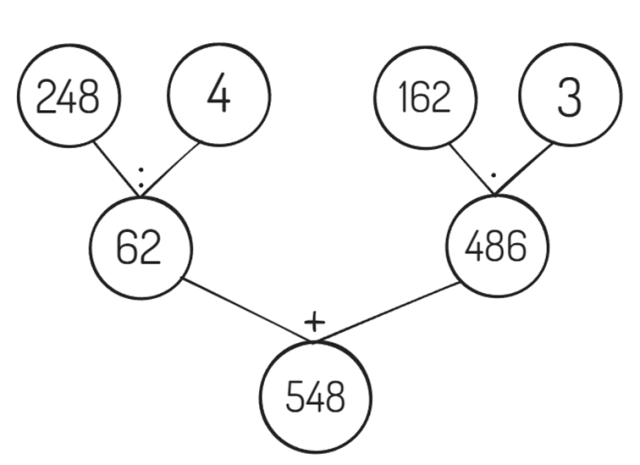 Obliczenia na drzewkach wykonuj od góry do dołu, w taki sposób, że operację matematyczną zapisaną pomiędzy kółeczkami wykonujesz na liczbach w tych kółkach, a wynik piszesz w kółeczku pod spodem. Liczba w kółeczku na samym dole to wynik działania.