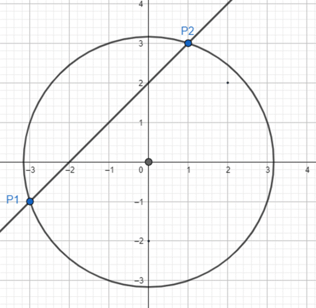 Zacznij od rozwiązania układu równań. Powyżej jest on rozwiązany metodą podstawiania. Następnie narysuj okrąg i prostą w jednym układzie współrzędnych.
