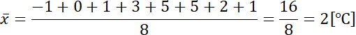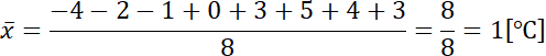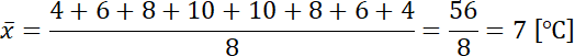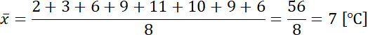 Rozwiązanie należy zacząć od odczytania najwyższej i najniższej temperatury w danym dniu. Następnie na podstawie tego oblicz rozstęp temperatur (różnica między najwyższą a najniższą). Kolejnym krokiem jest obliczenie średniej temperatury na zasadzie suma wszystkich zanotowanych temperatur podzielona przez ich ilość. Ostatecznie oblicz odchylenie standardowe wyników, jako pierwiastek wariancji (skorzystaj ze wzoru).