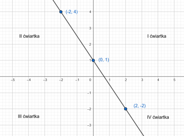Zaznacz uzyskane punkty w układzie współrzędnych, narysuj prostą przechodzącą przez nie i zapisz przez które ćwiartki układu współrzędnych ona przechodzi.