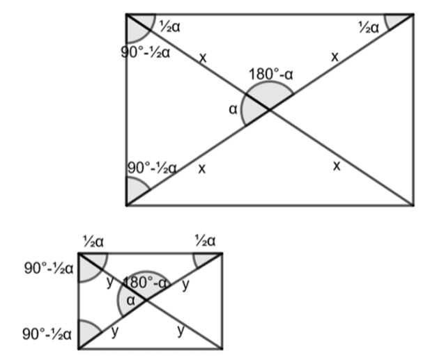 Przekątne dzielą prostokąt na cztery parami przystające trójkąty, a trójkąty przedstawione na rysunku w obu prostokątach są podobne z cechy KKK – odpowiadające sobie kąty mają takie same miary.