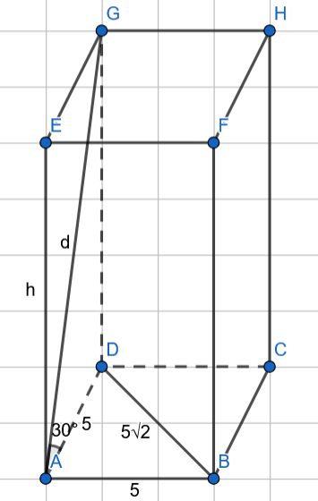 Wyznacz pole powierzchni całkowitej graniastosłupa prawidłowego czworokątnego, którego krawędź podstawy ma długość 5 cm, a przekątna jest ściany bocznej tworzy z krawędzią podstawy kąt