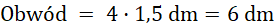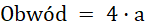 Obwód kwadratu obliczasz, mnożąc długość boku razy 4 (wszystkie boki kwadratu są równe), pole obliczasz, mnożąc długości boku kwadratu (podnosząc do potęgi drugiej).