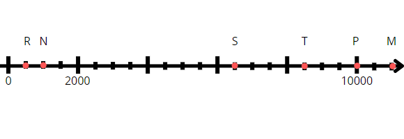 Są 3 punkty dzielące odległość między 0 a 2000 na 4 równe części, więc wystarczy 2000 : 4 = 500. Nasza jednostka to 500. Teraz wystarczy odpowiednio policzyć współrzędne wzrastające o 500.