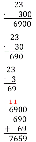 333 ꞏ 23 = 300 ꞏ 23 + 30 ꞏ 23 + 3 × 23 = 7659.