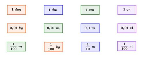 Skorzystaj z zależności między wielkościami określającymi długość, masę oraz kwotę.