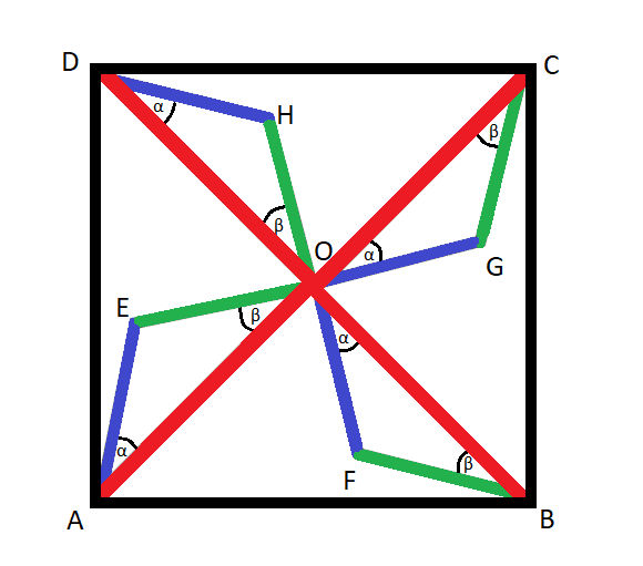 Odcinki OA, OB, OC, OD są równe, bo są połowami przekątnych. Równe sobie są również odcinki położone przy kącie α oraz te przy kącie β.