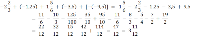 Dodawanie liczby ujemnej możemy zastąpić odejmowaniem jej wartości bezwzględnej. Żeby dodać lub odjąć ułamki sprowadzamy je do wspólnego mianownika, zamieniamy na ułamek niewłaściwy i odpowiednio dodajemy lub odejmujemy.