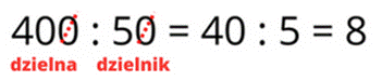 W przypadku dzielenia liczb zakończonymi zerami możemy najpierw skreślić w dzielnej i dzielniku tyle samo zer, a następnie wykonać dzielenie.