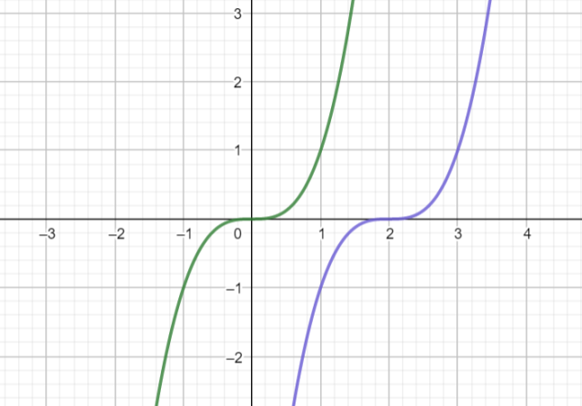 Wykres przesunięty o wektor [2, 0] – kolor zielony; y = (x - 2)3