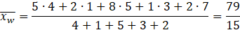 Oblicz średnią ważoną zestawu liczb 5, 2, 8, 1, 7, którym przypisano odpowiednio wagi: 4, 1, 5, 3, 2.