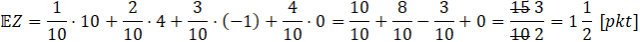 W tym zadaniu trzeba wyliczyć wartość oczekiwaną wyniku gry polegającej na losowaniu kuli z pudełka, w którym jest 1 kula w kolorze niebieskim, 2 w kolorze czerwonym, 3 w kolorze zielonym i 4 w kolorze białym, co daje łącznie 10 kul. W przypadku wylosowania kuli w kolorze niebieskim nagroda wynosi 10 punktów, w kolorze czerwonym 4 punkty, za zieloną traci się punkt, zaś za białą nic się nie zyskuje ani traci.