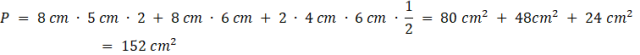 Oblicz pola powierzchni wszystkich figur tworzących siatkę i zsumuj je: