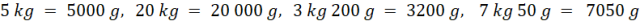 Zamieniając kilogramy na dekagramy, mnożymy razy 100, czyli dopisujemy dwa zera. Zamieniając kilogramy na gramy, mnożymy razy 1000, czyli dopisujemy trzy zera. Zamieniając tony na kilogramy, mnożymy razy 1000, czyli dopisujemy trzy zera.