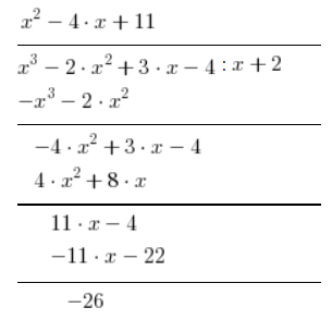 Pierwszy od lewej wyraz wielomianu kwadratowego dzielimy przez pierwszy wyraz podanego dwumianu. Następnie mnożymy go przez dzielnik x - 4 i wynik podpisujemy pod dzielną i odejmujemy go od niej poprzez dodanie wielomianu o przeciwnych współczynnikach. Otrzymujemy pierwszą resztę z dzielenia w ten sposób. Powtarzamy opisaną procedurę, dopóki nie otrzymamy wielomianu stopnia niższego niż dwumian przez które dzielimy. Jeśli jest to wieloma zerowy, to wieloma dzieli się bez reszty.