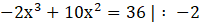 Porównujemy wzór funkcji do liczby 36, Przerzucamy wszystkie wyrazy na jedną stronę równości i szukamy miejsc zerowych powstałego wielomianu. Wynik Weryfikujemy z dziedziną funkcji V.