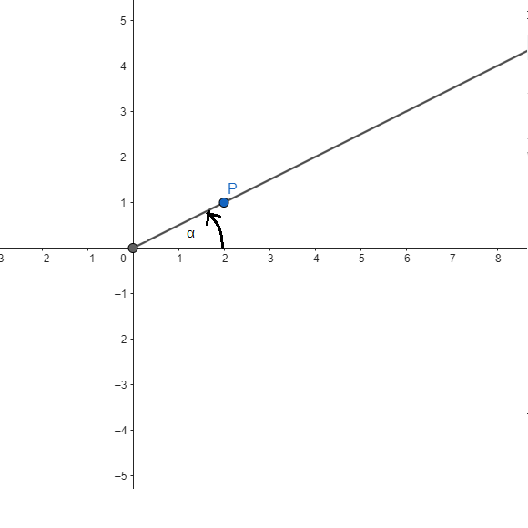 Zatem omawiany punkt ma współrzędne (2,1). Z początku układu współrzędnych powinieneś narysować prostą przechodzącą przez ten punkt. Szukany kąt znajduje się pomiędzy dodatnią półosią OX a narysowaną prostą.