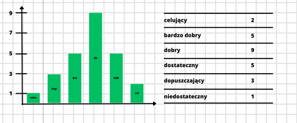 Na podstawie obliczeń z poprzedniego podpunktu wykonaj tabelę wskazującą, ile osób otrzymało daną ocenę. Następnie stwórz diagram słupkowy, którego oś pionowa wskazuje liczbą osób, zaś pozioma ukazuje poszczególne oceny. Każdy słupek rysuj na taką wysokość, by odpowiadał liczbie osób z określoną oceną.