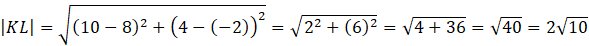 Mając dane K = (10, 4), L = (8, -2), wyznacz długość KL.