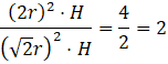 Niech podany w zadaniu walec ma promień podstawy długości 𝑟 i wysokość 𝐻. Promień składa się na połowę przekątnej podstawy graniastosłupa wpisanego i na połowę krawędzi bocznej graniastosłupa opisanego. Iloraz objętości wynosi więc: