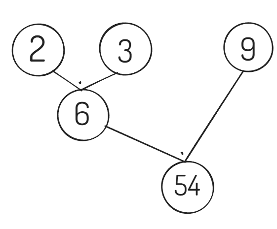 Obliczenia na drzewkach wykonuj od góry do dołu, w taki sposób, że operację matematyczną (w tym przypadku mnożenie) zapisaną pomiędzy kółeczkami wykonujesz na liczbach w tych kółkach, a wynik piszesz w kółeczku pod spodem. Liczba w kółeczku na samym dole to wynik działania.