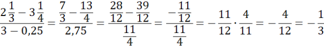 Ułamki znajdujące się w liczniku rozszerz do wspólnego mianownika i oblicz ich różnicę. Wartość mianownika zapisz za pomocą ułamka niewłaściwego. Dzielenie ułamków zamień na mnożenie przez odwrotność drugiego z nich. Skróć iloczyny na skos i oblicz ostateczny wynik.