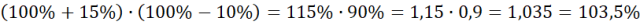 Oblicz iloczyn procentów podanych w treści zadania. Zapisz je za pomocą ułamków dziesiętnych i ustal o ile procent wzrosła otrzymana cena w porównaniu z początkową ceną, czyli 100%.