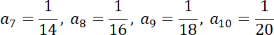 Ciąg składa się z kolejnych odwrotności kolejnych liczb dodatnich, więc 7 wyraz ciągu będzie odwrotnością siódmej liczby parzystej dodatniej, wyrazy 8, 9 i 10 będą odwrotnościami kolejnych liczb parzystych.