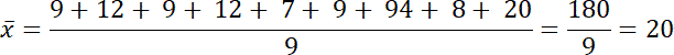 Należy obliczyć wyznaczone dane statystyczne liczb: 9, 12, 9, 12, 7, 9, 94, 8, 20.