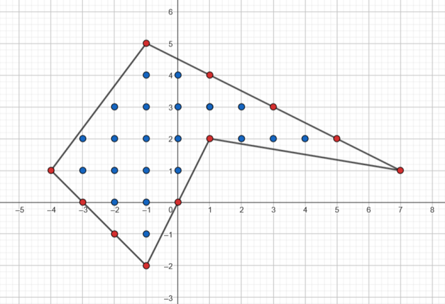 Wyznacz pole wielokąta ABCDE, jeśli A(-4,1), B(-1,-2), C(1,2), D(7,1), E(-1,5) korzystając z twierdzenia Picka.