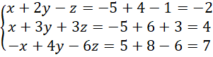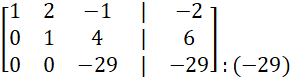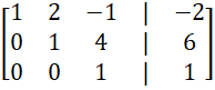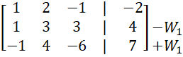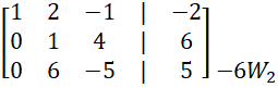 z trzeciego wiersza dodając do niego wiersz 1, a następnie odejmując sześciokrotność wierszu 2 oraz wartość