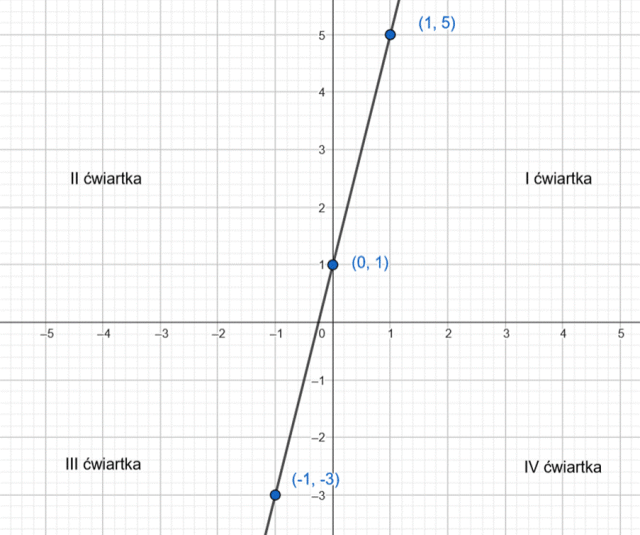 Zaznacz uzyskane punkty w układzie współrzędnych, narysuj prostą przechodzącą przez nie i zapisz przez które ćwiartki układu współrzędnych ona przechodzi.
