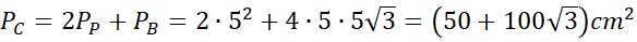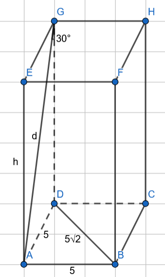 Wyznacz pole powierzchni całkowitej graniastosłupa prawidłowego czworokątnego, którego krawędź podstawy ma długość 5 cm, a przekątna jest ściany bocznej tworzy z krawędzią boczną kąt