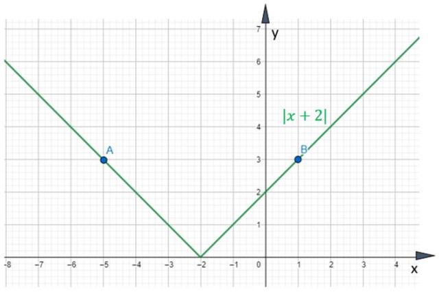 Po narysowaniu wykresu funkcji |x + 2| widać, że |x + 2| = 3, dla punktów A(–5,3) oraz B(1,3).