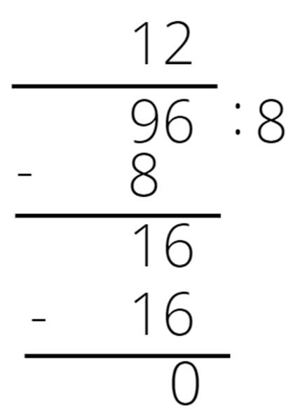 Sprawdź, ile razy mieści się pierwsza cyfra w dzielniku. Wynik zapisz nad kreską nad naszą cyfrą. Pomnóż zapisaną liczbę przez dzielnik i zapisz wynik pod pierwszą cyfrą. Zapisz pod tą liczbą kreskę i odejmij powyższe dwie liczby. Do uzyskanego wyniku dopisz kolejną cyfrę dzielnej i znowu sprawdź, ile razy mieści się ta liczba w dzielniku. Wynik zapisz nad kreską nad naszą cyfrą. Pomnóż zapisaną liczbę przez dzielnik i zapisz wynik pod drugą cyfrą. Zapisz pod tą liczbą kreskę i odejmij powyższe dwie liczby.