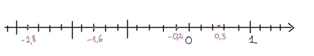 Jednostka użyta na osi to 0,2. Po lewej stronie zera są liczby ujemne. Im bardziej na lewo, tym są mniejsze liczby. Jeżeli trudno jest Ci to sobie wyobrazić, to pomyśl o tych liczbach jak o długu. Lepiej mieć u kogoś dług 10 zł niż 50 zł, dlatego -10 to więcej niż -50.