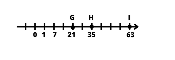 Musisz narysować oś liczbową. Następnie dobrać jednostkę i zaznaczyć punkty G = 21, H = 35, I = 63.