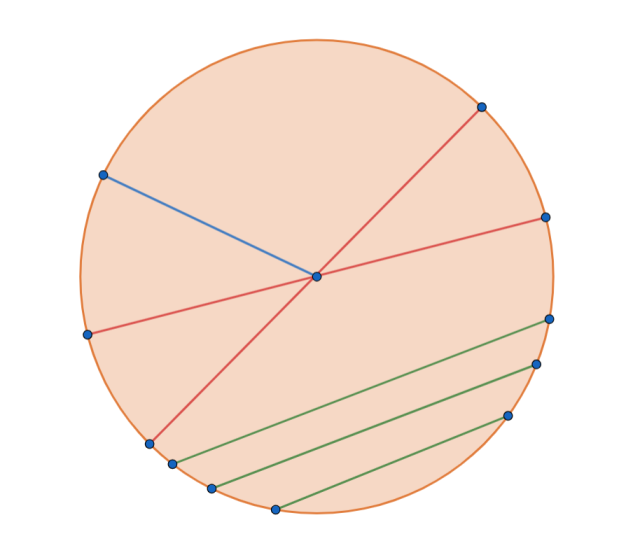 Promień zaznaczony jest na niebiesko, średnice na czerwono, a cięciwy na zielono.
