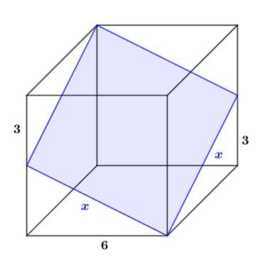 Wyznacz pole powierzchni przekroju sześcianu o długości krawędzi wynoszącej 6, który przedstawia rysunek.