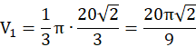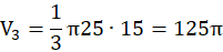 Małymi literami oznacz tworzącą, promień i wysokość mniejszego stożka, natomiast wielkimi – większego. Oblicz skalę podobieństw trzech stożków. Za jej pomocą ustal promień, tworzącą i wysokość trzech stożków i oblicz ich objętości. Różnica