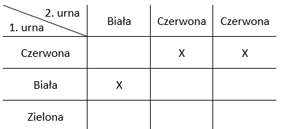 W tym zadaniu musisz obliczyć prawdopodobieństwo, że przy losowaniu kuli z urny, w której jest po jednej kuli czerwonej, białej i zielonej oraz losowaniu kuli z drugiej urny, w której są kula biała i 2 czerwone, wylosujesz dwie kule w tym samym kolorze.