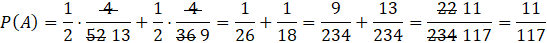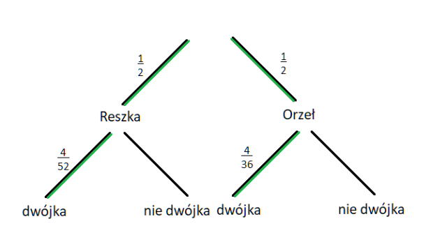Ponieważ doświadczenie losowe jest wieloetapowe, w tym zadaniu musisz narysować drzewko. Pierwszy poziom drzewka będzie odpowiadał rzutowi monetą, zaś drugi – losowaniu karty. Rzucając monetę może wypaść orzeł lub reszka, zaś losując kartę możesz wylosować albo dwójkę, albo coś innego i te przypadki zaznaczasz jako gałęzie. Prawdopodobieństwo wyrzucenia zarówno orła jak i reszki wynosi jedna druga, z kolei dla wylosowania dwójki obliczasz je z klasycznej definicji prawdopodobieństwa dzieląc ilość dwójek w danej talii przez wszystkie karty jakie są. Pamiętaj, że gdy wyrzuci się orła to losujesz kartę, z talii której usunięto figury. Gdy już narysujesz drzewo zaznacz te zdarzenia, których prawdopodobieństwo będziesz liczył oraz wszystkie gałęzie po drodze. Następnie przemnóż przez siebie prawdopodobieństwa na poszczególnych gałęziach oraz dodaj do siebie uzyskane wyniki z różnych gałęzi.