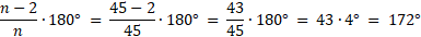 Wyznacz miarę kąta wewnętrznego czterdziestopięciokąta foremnego.