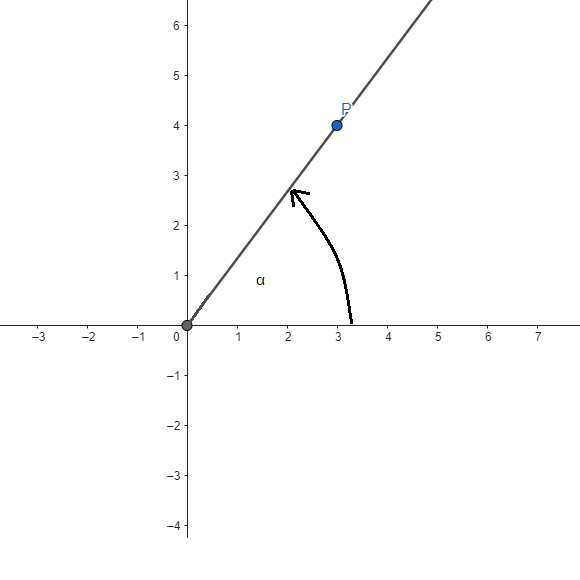 Omawiany punkt ma współrzędne (3,4). Z początku układu współrzędnych powinieneś narysować prostą przechodzącą przez ten punkt. Szukany kąt znajduje się pomiędzy dodatnią półosią OX a narysowaną prostą.