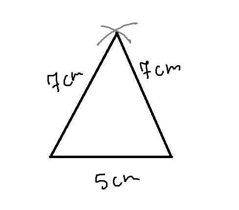 Narysuj od linijki poziomy odcinek o długości 5 cm, następnie używając cyrkla, odmierz 7 cm i przyłóż go do jednego z końców odcinka i narysuj duży łuk. Następnie przyłóż go do drugiego końca odcinka i narysuj łuk. Miejsce przecięcia łuków zaznacz punktem i połącz z podstawą.