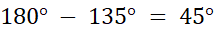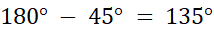 Kąt ten ma 45º. Kąt 45º oraz kąt przy prawym górnym wierzchołku leżą przy tym samym ramieniu. Z tego wynika, że w sumie mają 180º.