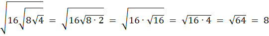 Możliwie uprość wyrażenia pod kolejnymi pierwiastkami, oblicz po kolei wartości pierwiastków, zaczynając „od wewnątrz”. Pamiętaj o kolejności wykonywania działań: potęgi/pierwiastki, mnożenie/dzielenie, dodawanie/odejmowanie.