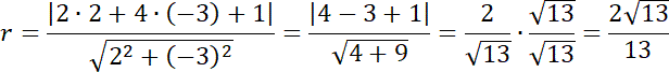 Zacznij od zapisania równania prostej w postaci ogólnej. Zauważ, że odległość środka okręgu od stycznej jest równa promieniowi, ponieważ prosta l jest styczna do okręgu. Skorzystaj ze wzoru na odległość prostej od punktu, aby obliczyć długość promienia okręgu.
