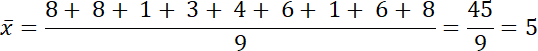 Należy obliczyć wybrane dane statystyczne liczb: 8, 8, 1, 3, 4, 6, 1, 6, 8.